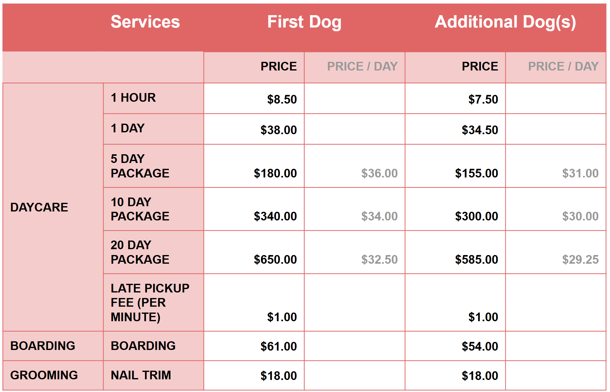 Boarding rates are charged per night. All boarding dogs are included in daycare playgroups during the day. As long as boarding dogs are picked up before 10am on their day of pickup, there will be no additional daycare charges. If pickup is after 10am, regular daycare rates apply.